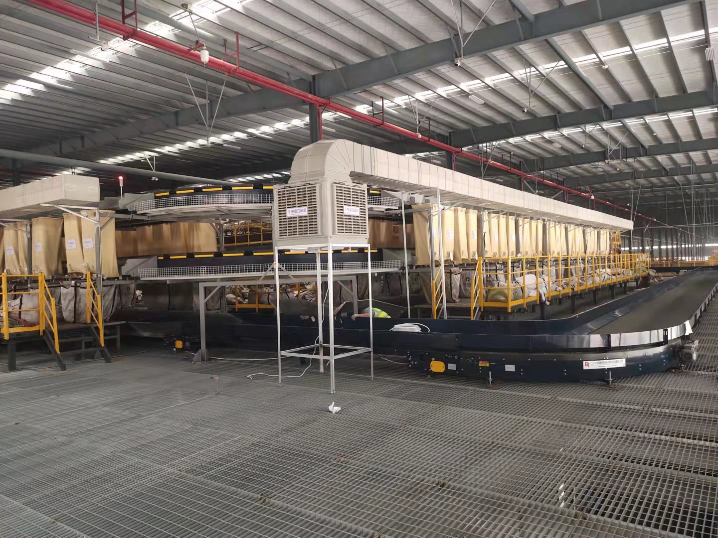 百世集團(tuán)廣州番禺分撥是一家大型物流運轉(zhuǎn)中心,場地面積50000平方,倉庫主體是鋼結(jié)構(gòu),廣州夏季溫度高倉儲運轉(zhuǎn)設(shè)備發(fā)熱多等特點,夏季庫房溫度達(dá)到40度左右,分揀員工無法正常工作,有可能發(fā)生意外和中暑,我公司工程師經(jīng)過現(xiàn)場勘查,設(shè)計50臺夏瑞22型冷風(fēng)機(jī),加裝管道采取定點崗位送風(fēng),另外配XR-730型工業(yè)大吊扇,安裝后室內(nèi)溫度達(dá)到30度左右,通過大風(fēng)扇把涼爽空氣送到每個角路,大大的改善了工作環(huán)境,受到領(lǐng)導(dǎo)和員工一直好評。