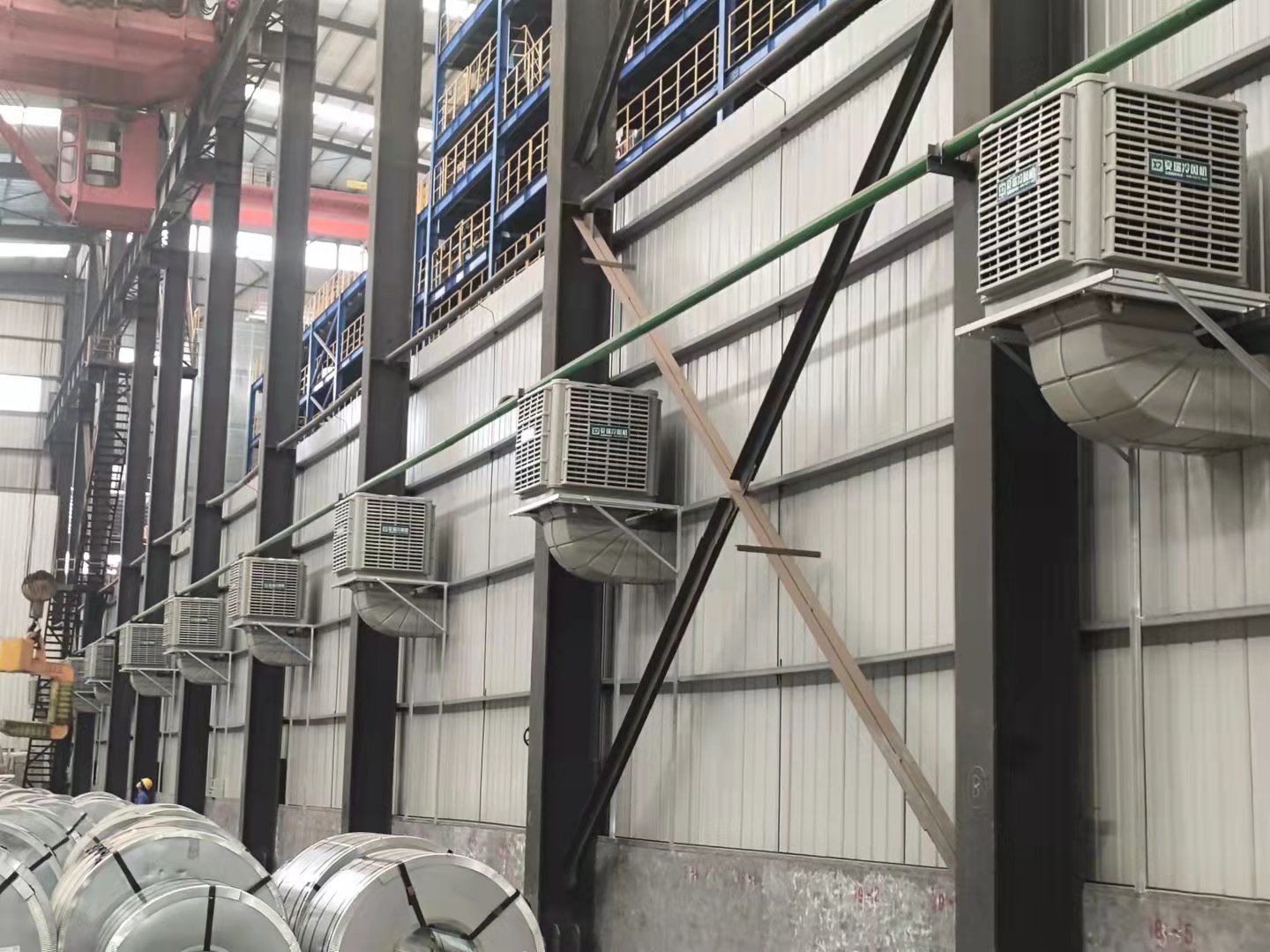 我公司為金泰包裝改造連退新車間通風(fēng)降溫,連退車間高36米寬18米長200米,整個車間連退設(shè)備發(fā)熱量大設(shè)備多,設(shè)備高30米,高處維修平臺正常溫度達(dá)到55到60度,極端天氣能達(dá)到65度,工人上去幾分鐘就中暑,我公司設(shè)計1460型玻璃鋼負(fù)壓風(fēng)機60臺向外排熱氣,在廠房兩次安裝20臺22型濕簾冷風(fēng)機往車間送大量冷風(fēng),設(shè)備安裝運行以后車間溫度降到40度左右,極大的改善了工作環(huán)境。